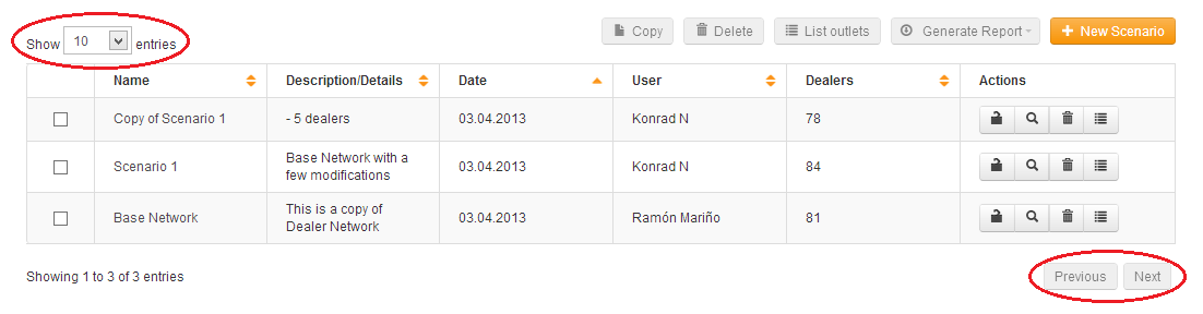 You can increase the number of scenarios on display in the list by changing the value in the Show... entries dropdown menu.