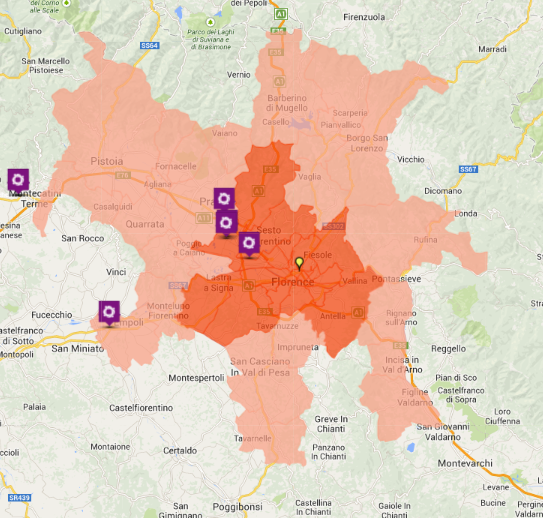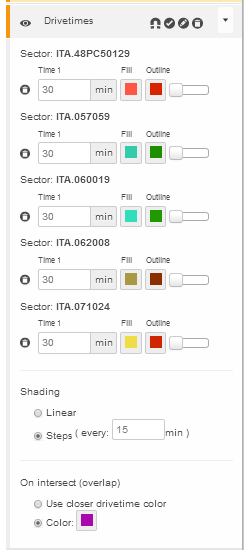 Drivetimes are shaded in 15 minute bands, but you can change the banding or steps by changing the option in the shading steps box towards the bottom, including the option to have a linear shading. Finally, you can define which colour to show if two or more drivetimes (from different locations) intersect using the settings at the bottom.
