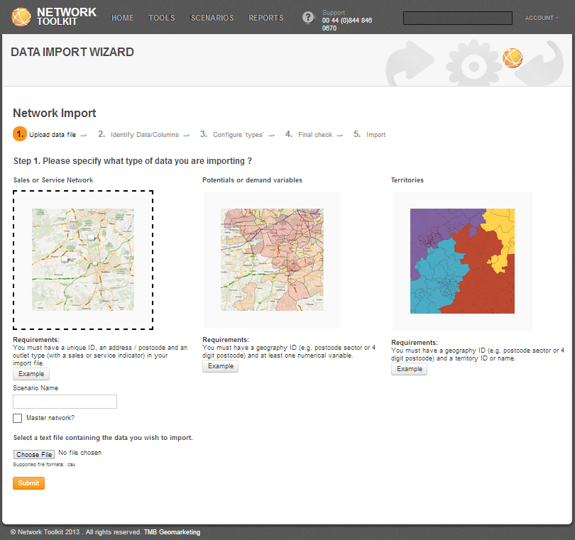 This button allows you to create the new scenario. After you click on it, it will take you directly to Data Import Wizard where you can upload various kinds of data into Network Toolkit:
