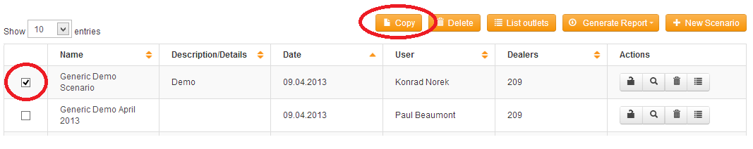 Another way to create a new scenario is to use one of the existing ones. This option allows to create a copy of any scenario. Select a scenario to duplicate and click on Copy button: