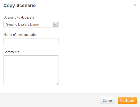 On the popup window, type in a new name and add comments for the new scenario. Click on the duplicate button.