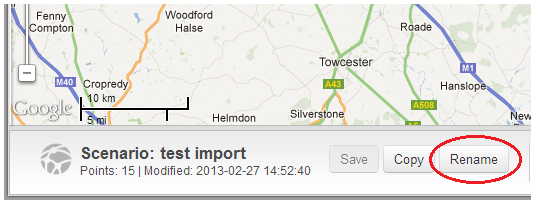 You can rename a scenario by clicking on the Rename button (see below highlighted in red) in the scenario map panel on the bottom of the screen.