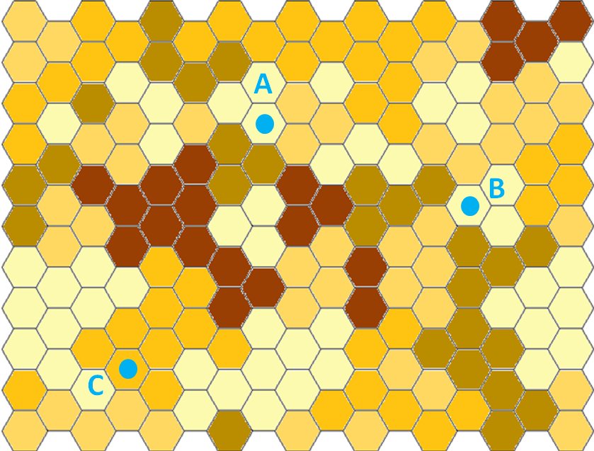This is illustrated below in figure 1. The hexagon shapes represent some type of geography, such as postcode sectors (UK), Germeinde (Germany) or Communes (France). In each piece of geography, there is a demand (potential) for the product, usually expressed as an annual expected number of sales or annual demand for service. In our case, the level of demand is related to the shading; light yellow – small demand, dark brown – high demand. The Blue dots are the locations of dealers A, B and C. In this simple example, we should assume that this area represents the country, and that there are 3 dealers in the network.