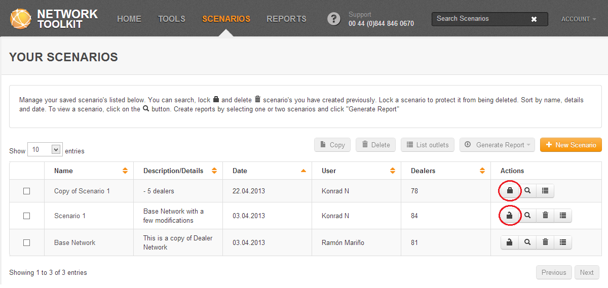 You can lock a scenario to protect it from being deleted. To lock a scenario, click on the Lock button which is located in the same row as the scenario you wish to lock. The symbol on the lock icon will change to Locked to show that it is locked. At the same time, the Delete button for that scenario will disappear.