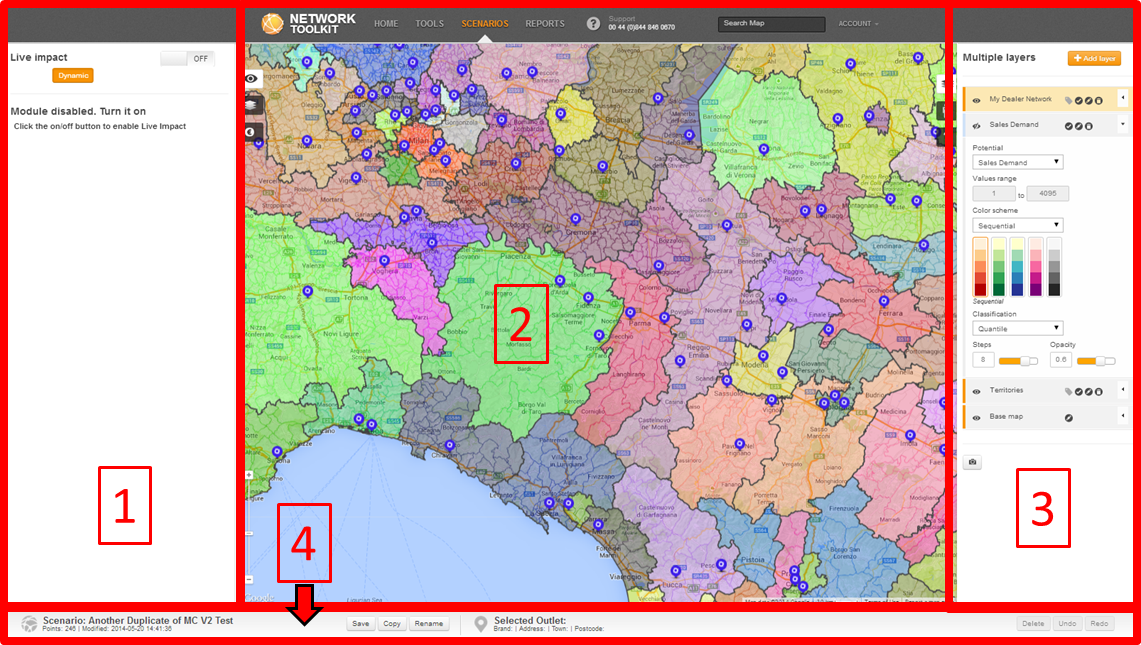 1. To the left of the map window is the Live Impact / Sales performance panel.