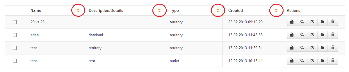 Click on the sort ascending / descending orange arrows (see below highlighted in red) at the top of the Name, Description/Details, Type or Created field. The Report Manager will sort the available list on any field that you sort on. You can also sort on the filtered search results.
