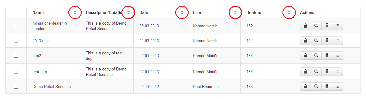 Click on the sort ascending / descending arrows (see below highlighted in red) at the top of the Name, Description, Date, User or Dealers columns. The Scenario Manager sorts the list of available scenarios in the column that you apply the sorting function. You can also use sorting on the filtered search results.