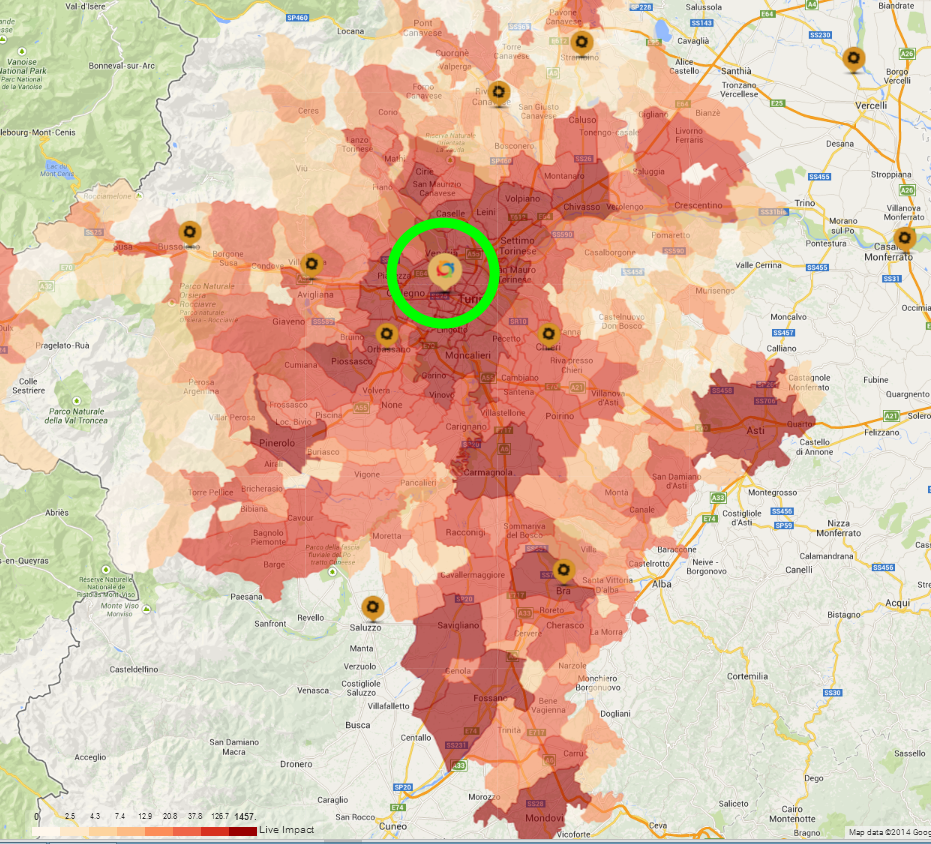 As you make changes to your network, you will see the calculations change in the table in the LiveImpact Panel. You will also see that the shading on the map changes, depending upon which dealer you have selected. By selecting one outlet (see green circle below), the shading will relate to the allocation of potential to this outlet. This gives you some idea of where the opportunity / potential will be coming from , for that outlet. The legend at the bottom of the map will indicate the volumes allocated to the outlet from each piece of geography / postcode / commune.