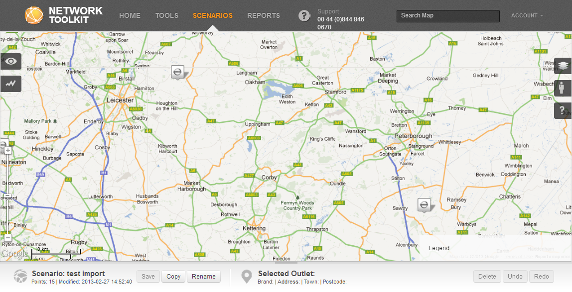 The scenario map is the main interface for creating and editing scenarios. It also provides an easy interface for dynamically calculating sales and service potentials for your outlets and also seeing the impact when you make any changes to the scenario. Make sure that you are familiar with the intuitive functions so that you are confident of navigating this important work area of Network Toolkit.