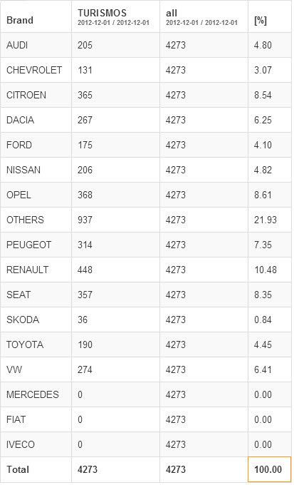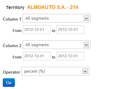 In this example, you can see registrations for the selected territory for the represented brands and for the segments that you selected. The operator selected is market share. When this happens, column 2 will be filled with the total (sum) of column 1 in order to calculate the share figure. If you slected data for column 2 it would have been replaced by this.