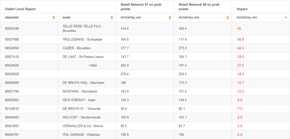 An outlet level report is a report with a row of information on each outlet or dealer. The report format is typically an outlet ID or Code, an outlet name and then one or more potentials for that outlet. If only one scenario is selected for an outlet report, the report will only list the potentials against the outlets for one scenario. If two scenarios are selected, then two sets of potentials will be displayed as well as an impact column to show the difference between the potentials in different scenarios.